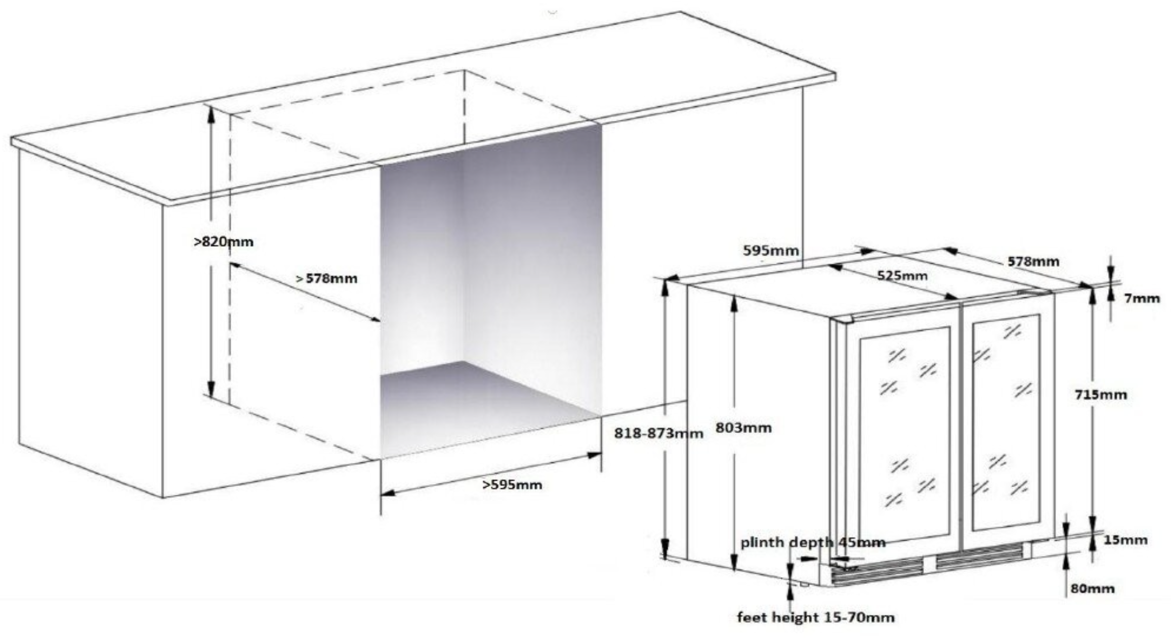 Instalação livre ou encastre - Capacidade de 46 garrafas - 2 zonas de temperatura ajust. 5º a 10ºC e de 10º a 18ºC - Umidade constante ≥ 65 % - 6 prateleiras de madeira extraíveis sobre calhas - Porta reversível, fechadura, vidro triplo anti-UV - Visor Digital do controlo da temperatura, luz LED - Frio por compressor sobre borracha anti-vibração - Sistema de ventilação interna (frio ventilado) - Baixo nível de ruído (41 dB) - 90 W de potência (154 kWh/ano) – Classe G - Medidas 59,5 x 59,5 x 80 cm (LxPxA) - 4 pés ajustáveis