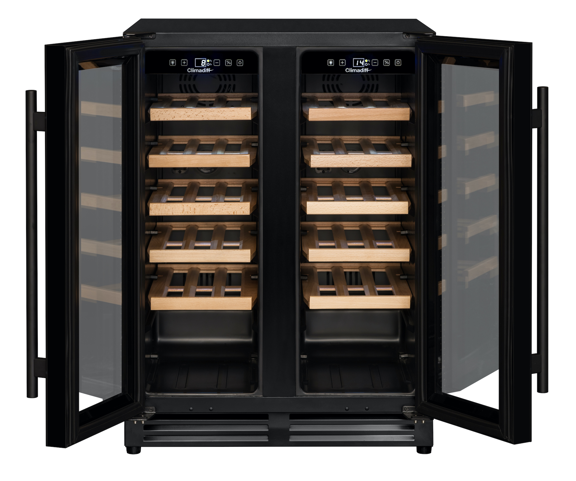 Cave de vinho 2 portas (double-door) – Encastre debaixo do balcão – Capacidade até 40 garrafas – Temp. ajustável de 5°C até 20°C em cada compartimento – 10 prateleiras (madeira) – Vidros com tratamento anti-UV – Visores digitais do controlo das temperaturas, luz LED – Frio ventilado – Compressor – Anti-vibração – Filtros de carvão ativo – Pés ajustáveis – Compatível com a aplicação móvel VINOTAG (gestão dos vinhos) – Silencioso (nível de ruído 39 dB) – Baixo consumo elétrico (anual: 115 kWh) – Eficiência energética F – Medidas 59,5 x 57,5 x 82 cm (LxPxA)