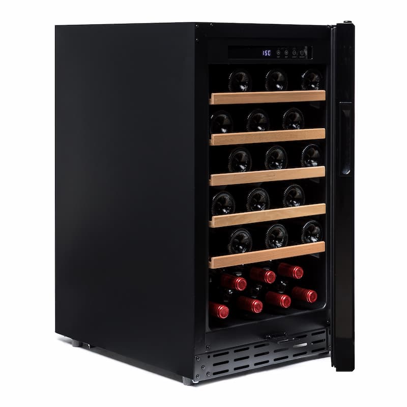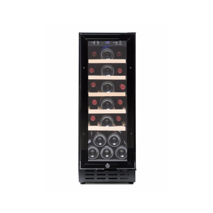 Instalação livre ou encastre - Capacidade de 20 garrafas - Temp. ajustável 5° a 18°C - 5 prateleiras de madeira extraíveis - Porta reversível, fechadura, vidro triplo anti-UV - Umidade constante ≥ 65 % - Visor Digital do controlo da temperatura, luz LED - Frio por compressor sobre borracha anti-vibração - Sistema de ventilação interna (frio ventilado) - Baixo nível de ruído (38 dB) - 90 W de potência (98 kWh/ano) – Classe F (ex-classe A+) - Slim - medidas 29,5 x 57,5 x 80 cm (LxPxA) - 4 pés ajustáveis