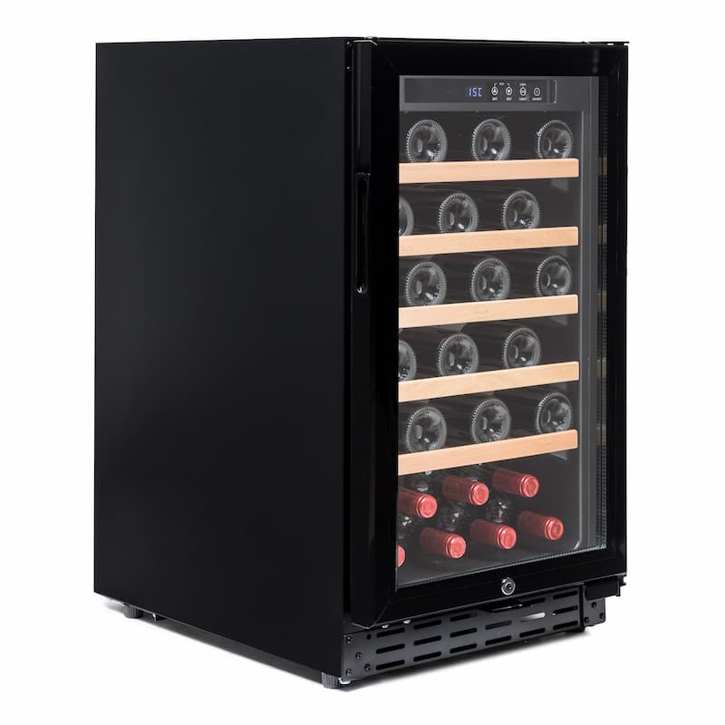 Capacidade até 28 garrafas - Mono temperatura - Compressor - Porta vidro design black Piano anti-UV - 2 prateleiras (madeira) - Sistema anti-vibração - Luz LED branca com interruptor - Termómetro com visor digital - Tipo de frio: ventilado - Seguridade: alarmes visuais e sonoros - Nível de ruído : 40 dB - Temp. ajustável: 5°C - 20°C - Consumo eléctrico anual: 135 kWh - 59 x 56,3 x 45,5 cm (LxPxA)
