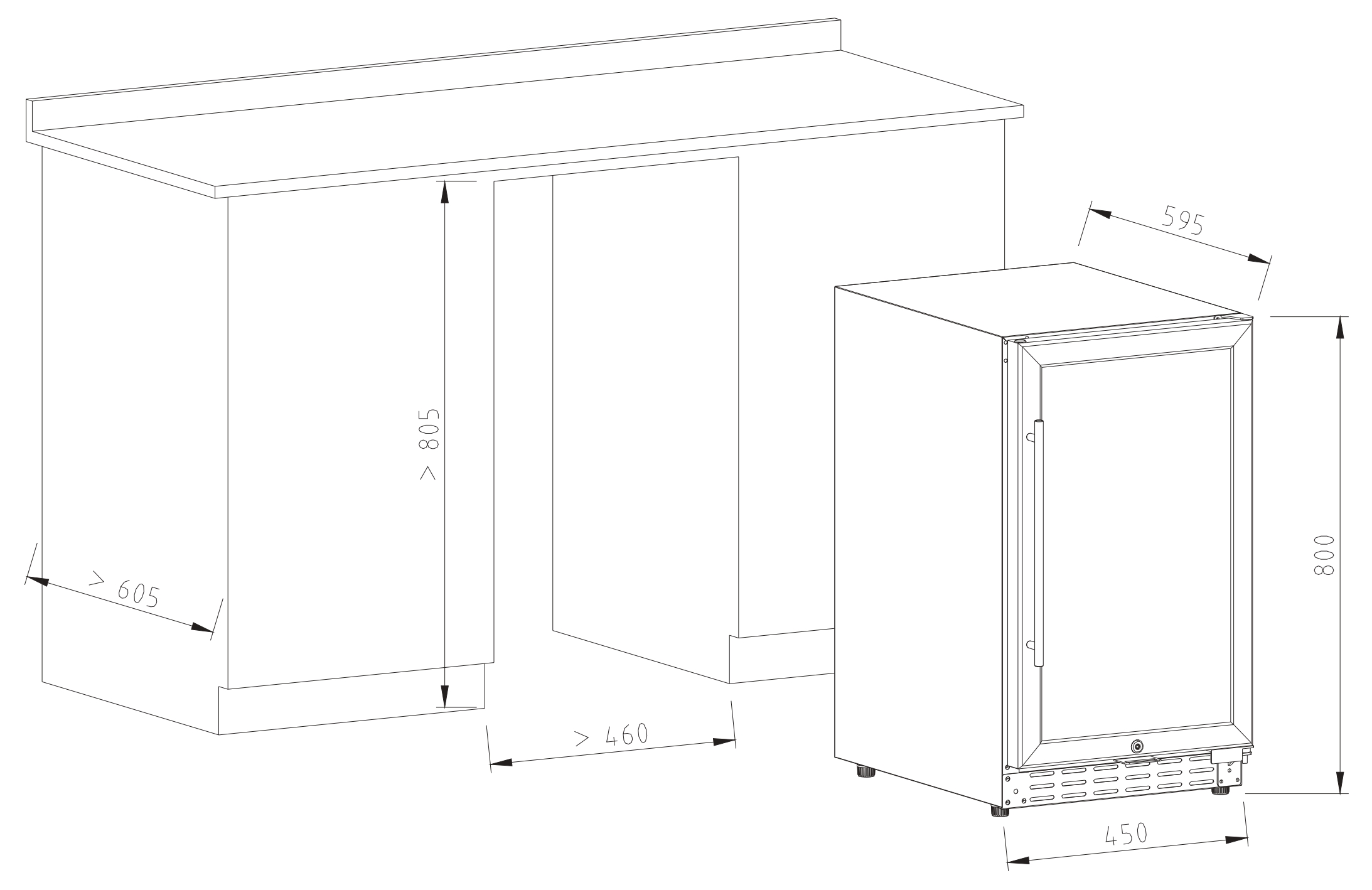 Encastre - Capacidade de 24 garrafas - Temp. ajustável 5° a 18°C - 3 prateleiras de madeira extraíveis sobre calhas - Porta Inox com vidro duplo anti-UV - Umidade constante ≥ 60 % - Visor Digital do controlo da temperatura, luz LED - Frio por compressor sobre borracha anti-vibração - Sistema de ventilação interna (frio ventilado) - Baixo nível de ruído (41 dB) - 80 W de potência (178 kWh/ano) – Classe G (ex-classe A) - Medidas 59,5 x 54,5 x 45,5 cm (LxPxA) - Sem pés ajustáveis (encastre)
